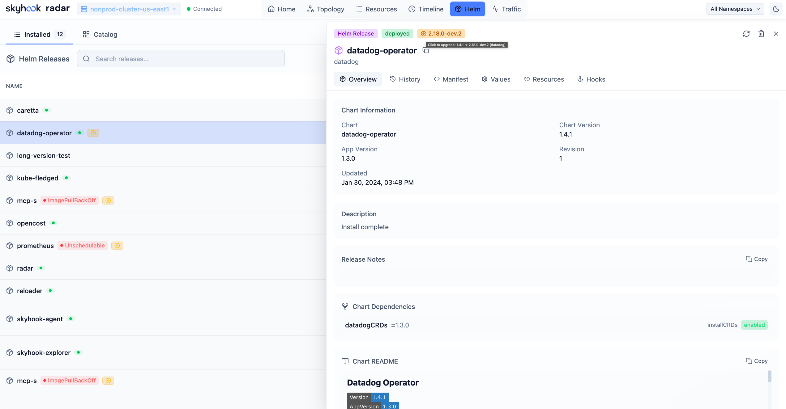 See all Helm releases across namespaces with status, chart version, and app version. Each release shows the health of its owned resources, so you know at a glance if something's wrong. Inspect values, compare revisions, view release history. Install, upgrade, rollback, or uninstall directly from the UI.